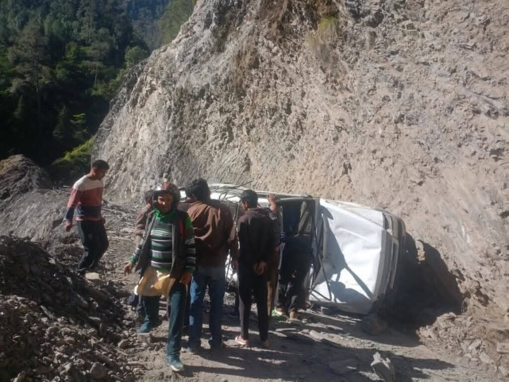 बोल्डर की चपेट में आने से सड़क पर पलटा वाहन, चालक घायल